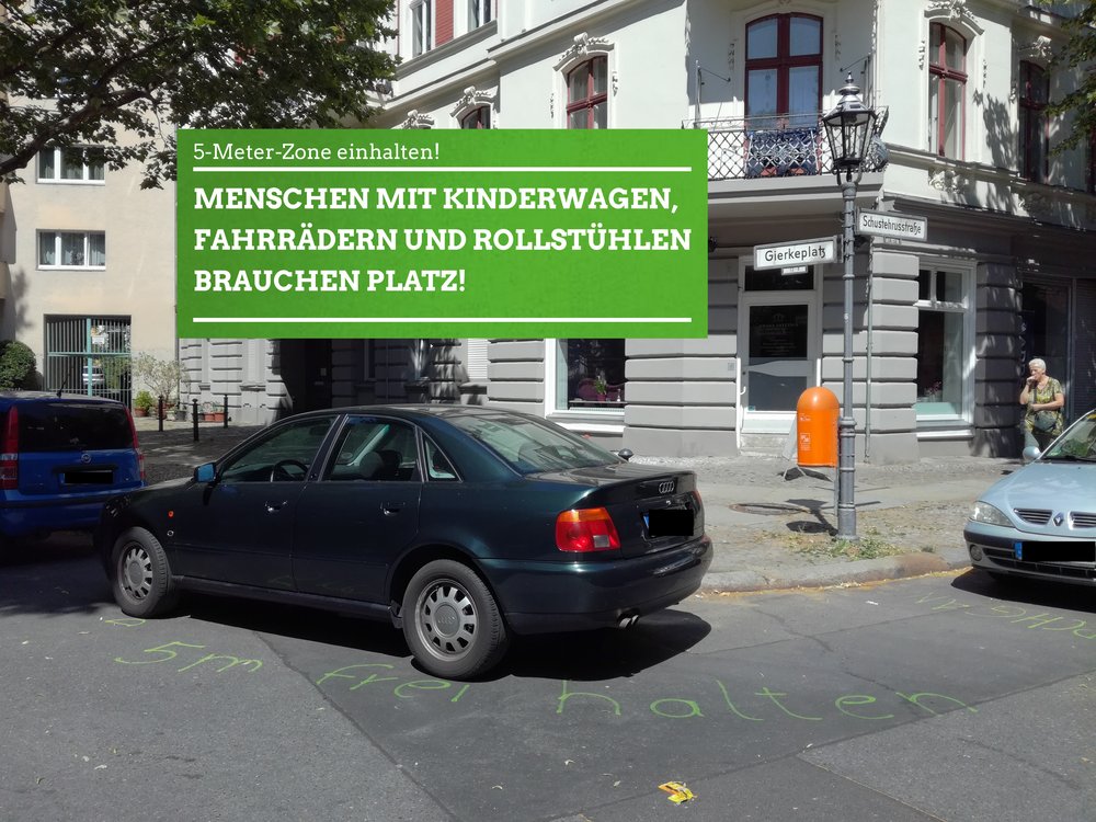Auf dem Bild sieht man eine Aktion von Kindern an der Gierkezeile, die mit Kreide Autofahrende auffordern, nicht m Kreuzungsbereich zu parken.
