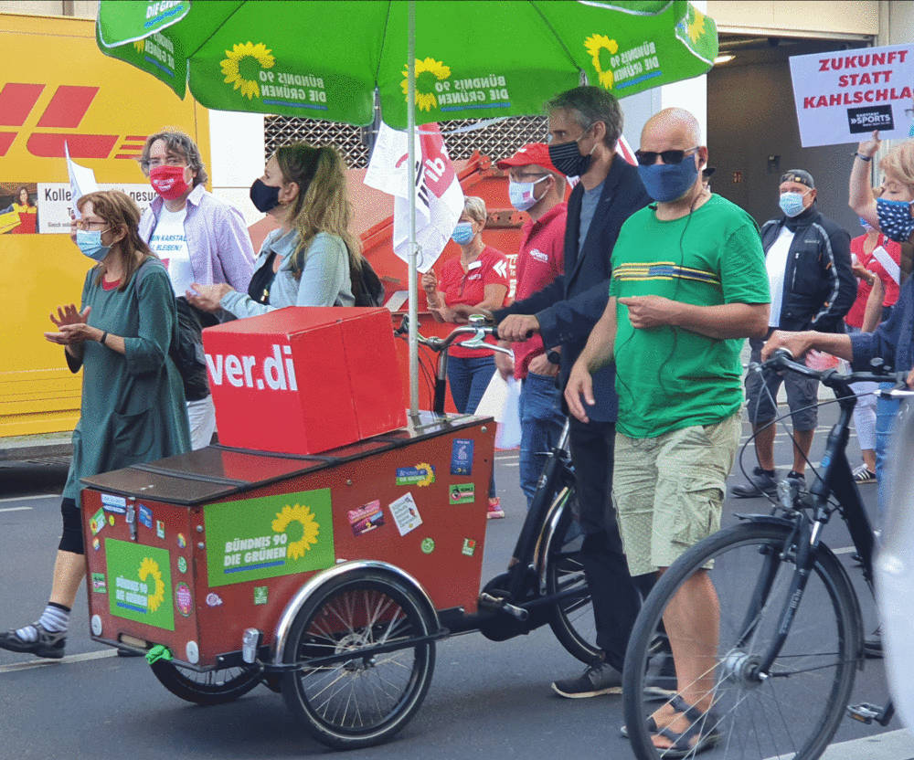 Der Grüne Kreisverband folgte dem Aufruf von Verdi und unterstützte die Betriebsräte bei ihrer Demo für den Erhalt von Arbeitsplätzen und eine sozialverträgliche Lösung für alle Mitarbeiter*innen. Mit dabei in der Kantstrasse waren für den Kreisvorstand Herbert Nebel, Ingrid Lienke und Kirstin Bauch.