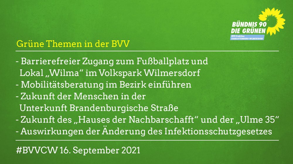 Unsere Fraktion regt einen barrierefreien Zugang zum Fußballplatz und zum Lokal „Wilma“ im Volkspark Wilmersdorf an. Für mobilitätseingeschränkte Menschen sowie Personen mit Kinderwagen ist es schwer, dorthin zu kommen. Der 1. FC Wilmersdorf soll in die Planungen mit einbezogen werden.