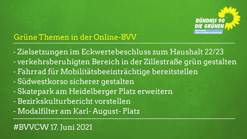 Welche Schwerpunkte setzt das Bezirksamt im kommenden Haushalt? Wir fragen in der Bezirksverordnetenversammlung (BVV): „Welche Mittel will das Bezirksamt einsetzen, um die dringend erforderlichen Maßnahmen in den Bereichen Klimaschutz und Verkehrswende zu verstärken?“ Unsere Fraktion will erfahren, welche Haushalts- und Personalmittel die Ämter im Eckwertebeschluss zum Haushalt 2022/2023 pro Abteilung und Amt bekommen.