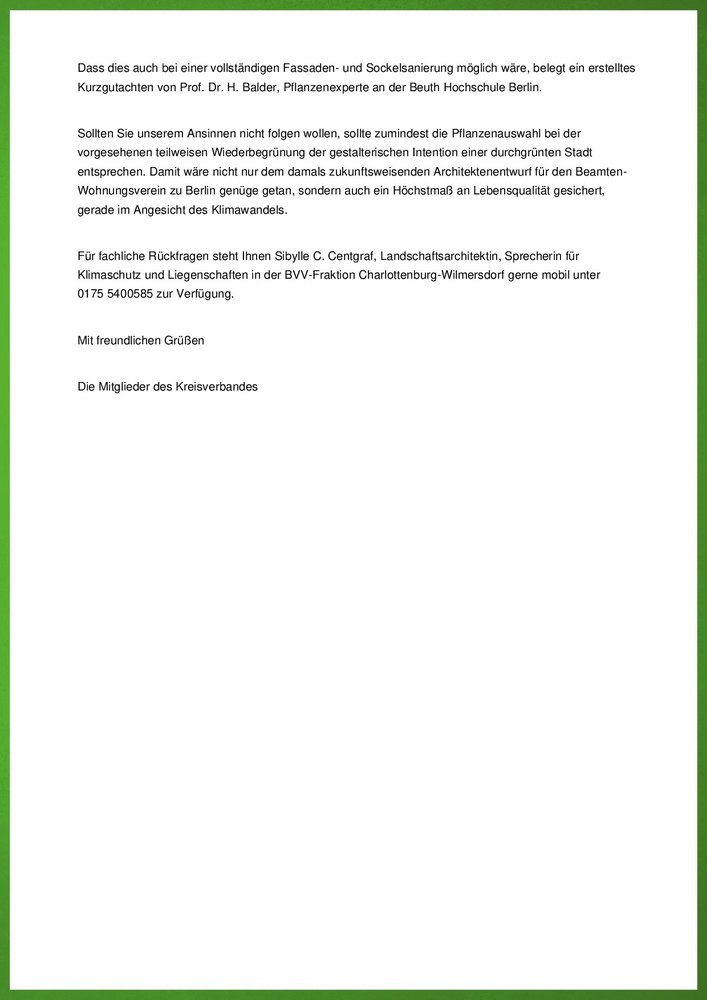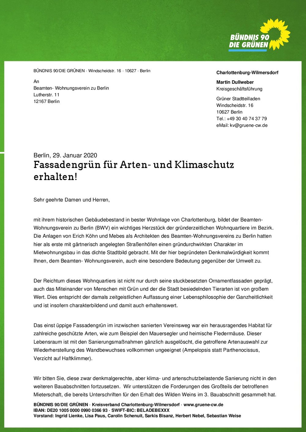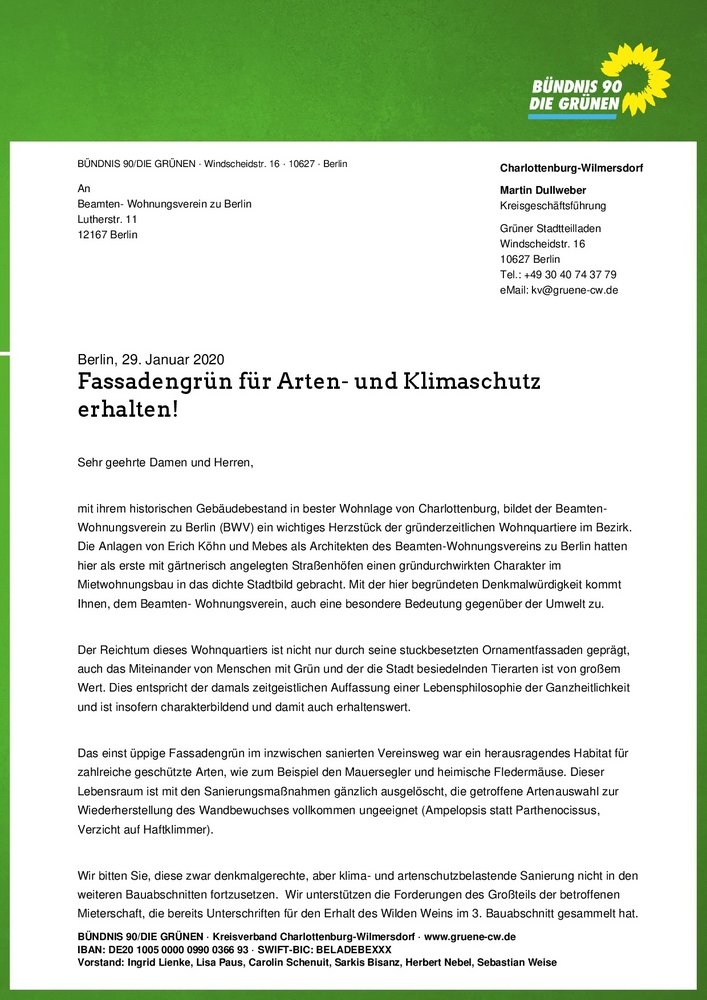 Auf der Mitgliederversammlung am 28.01.2020 haben die Mitglieder des Kreisverbands Charlottenburg-Wilmersdorf den erarbeiteten Antrag der BVV Fraktion, der Sprecherin für Klimaschutz und Liegenschaften Sibylle Centgraf, zum Thema "Offener Brief des Kreisverbandes Charlottenburg-Wilmersdorf von Bündnis 90/Die Grünen an den Beamten-Wohnungs-Verein zu Berlin anlässlich der Fassadeninstandsetzung Horstweg 10 - 11a + 12" beschlossen.