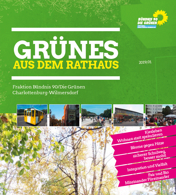 In der aktuellen Ausgabe "Grünes aus dem Rathaus "stellen die Bezirksverordneten und Stadtrat Oliver Schruoffeneger ausgewählte Schwerpunkte ihrer Arbeit vor. Die Öffnung des Olympiaparks für den Breitensport, gutes Personalmanagement gegen Fachkräftemangel im Bezirksamt oder Schulwegsicherheit sind nur einige Themen, welche die Fraktionär*innen bewegen. Lesen Sie außerdem Beiträge zum Problem der steigenden Mieten, zur Bedeutung des städtischen Grüns oder zur Stärkung der Musikschule im Bezirk. Wir wünschen viel Spaß beim Lesen! Wenn Sie Anregungen und Fragen haben, wenden Sie sich gern an die Mitglieder unserer Fraktion.