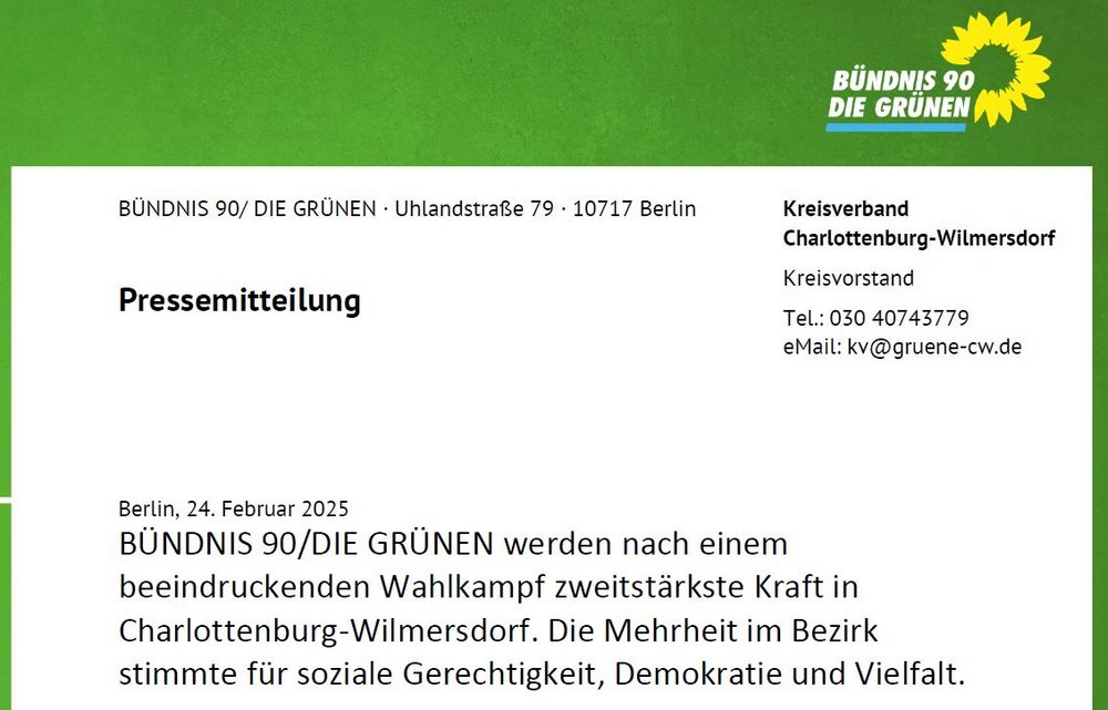 Pressemitteilung "BÜNDNIS 90/DIE GRÜNEN werden nach einem beeindruckenden Wahlkampf zweitstärkste Kraft in Charlottenburg-Wilmersdorf. Die Mehrheit im Bezirk stimmte für soziale Gerechtigkeit, Demokratie und Vielfalt."
