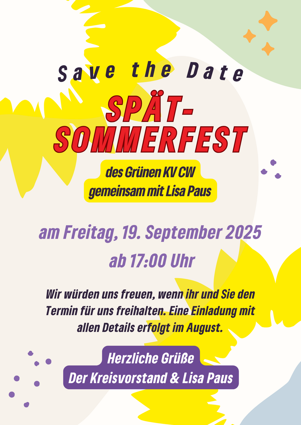 wir freuen uns sehr, Sie und euch schon heute auf unser Spätsommerfest am 19. September 2025 hinzuweisen, das wir gemeinsam mit Lisa Paus veranstalten.
